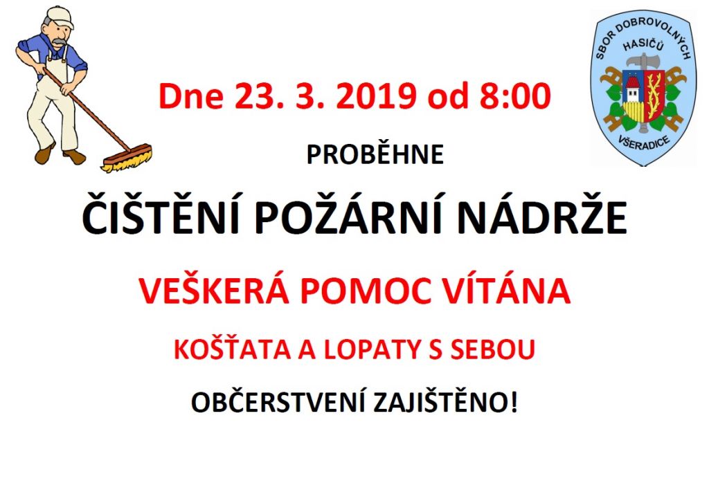 Dne 23. 3. 2019 od 8:00 proběhne čištění Všeradické požární nádrže. Jakákoliv pomoc vítána. Občerstvení zajištěno.